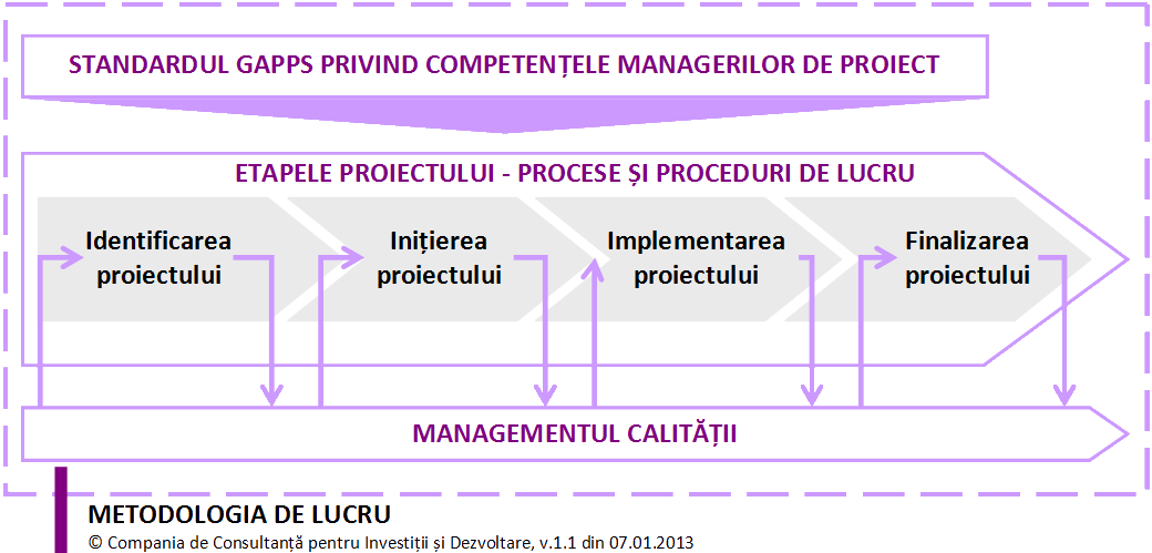Metodologia noastră se bazează pe procese și proceduri de lucru dezvoltate în acord cu standardul GAPPS(1), care stabilește competențe în ceea ce privește managementul proiectului. De altfel, deși nu este membru GAPPS(2), standardul a fost preluat în România, aproape în integralitatea lui, de către Autoritatea Națională pentru Calificări(3), care a dezvoltat un standard ocupațional pentru managerii de proiect, Cod COR 241919. De la standardul dezvoltat de GAPPS se revendică o serie de metodologii și/sau programe(4) pentru dezvoltarea abilităților de management a proiectelor, printre care, PRINCE2(5) și ICB v3.0(6) cartografiază cel mai bine standardul (peste 90%). În paralel, PRINCE2 și PMBoK(7) se bucură de cea mai largă recunoaștere la nivel global. Având în vedere cele de mai sus, am considerat PRINCE2 ca fiind metodologia de management care se potrivește cel mai bine proiectelor pe care le dezvoltăm pentru clienții noștri. Cu toate acestea, suntem deschiși și îmbrățișăm cu ușurință orice model de management al proiectelor, având în vedere faptul că toate se revendică, într-o măsură mai mică sau mai mare, în standardul dezvoltat de GAPPS.
